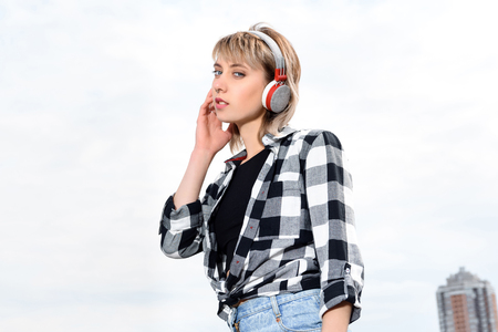 白人の女の子はヘッドフォンで音楽を聴くとカメラ目線 の写真素材 画像素材 Image 7963