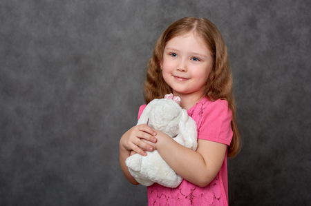 ピンクのドレスの女の子はぬいぐるみを抱きしめる の写真素材 画像素材 Image